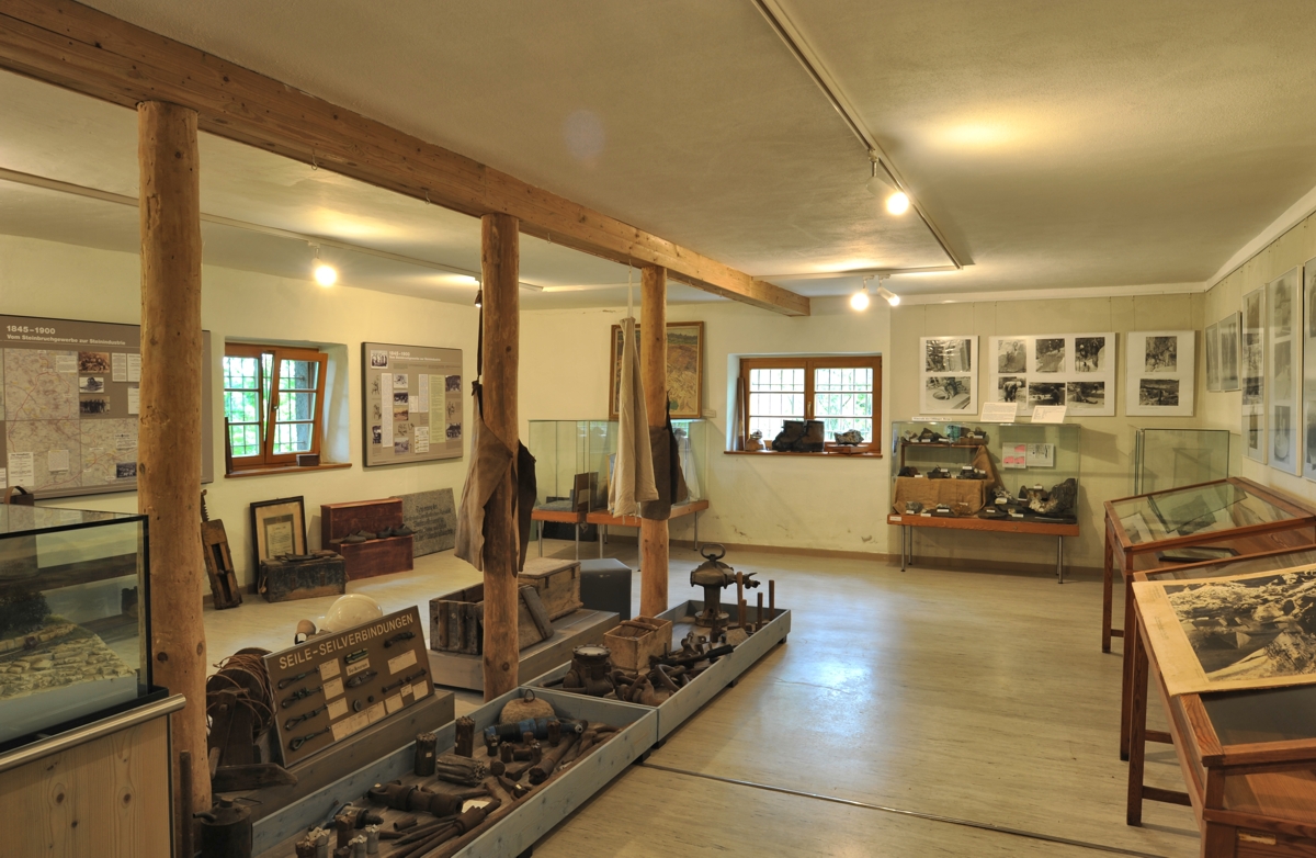 Ein großer Museumsraum in einem der Flachbauten bewahrt Werkzeuge, historische Fotos, Texte, Modelle und Gesteinsmuster aus den